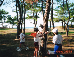 有明浜の周りにある松の木が松喰い虫にたべられてきた。そして,東小学校の、4年生と南小学校の5年生と一緒に、松の木を、調べました。まず、松の木の、幹の太さを、測りました。1メートル以内の、松の木の幹に、白いひもをつけました。1メートル以上の松の木もありました。1メートル以上の松の木には、赤いひもをつけました。。みんな、がんばっていたので、10分ぐらいしかかりませんでした。