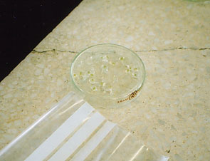 薬を入れて、かきまぜて、三角フラスコに、スポイトで、ランの種をうつしました。15分後・・・三角フラスコの中からランの種を取り出すと透明の膜ができていました。実験が成功しました。イクラははほとんどこのように作られて人工イクラだとわかりました。